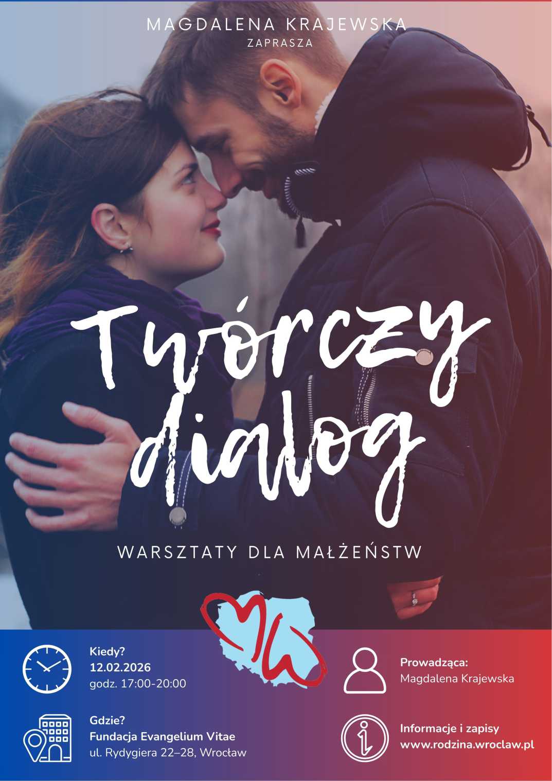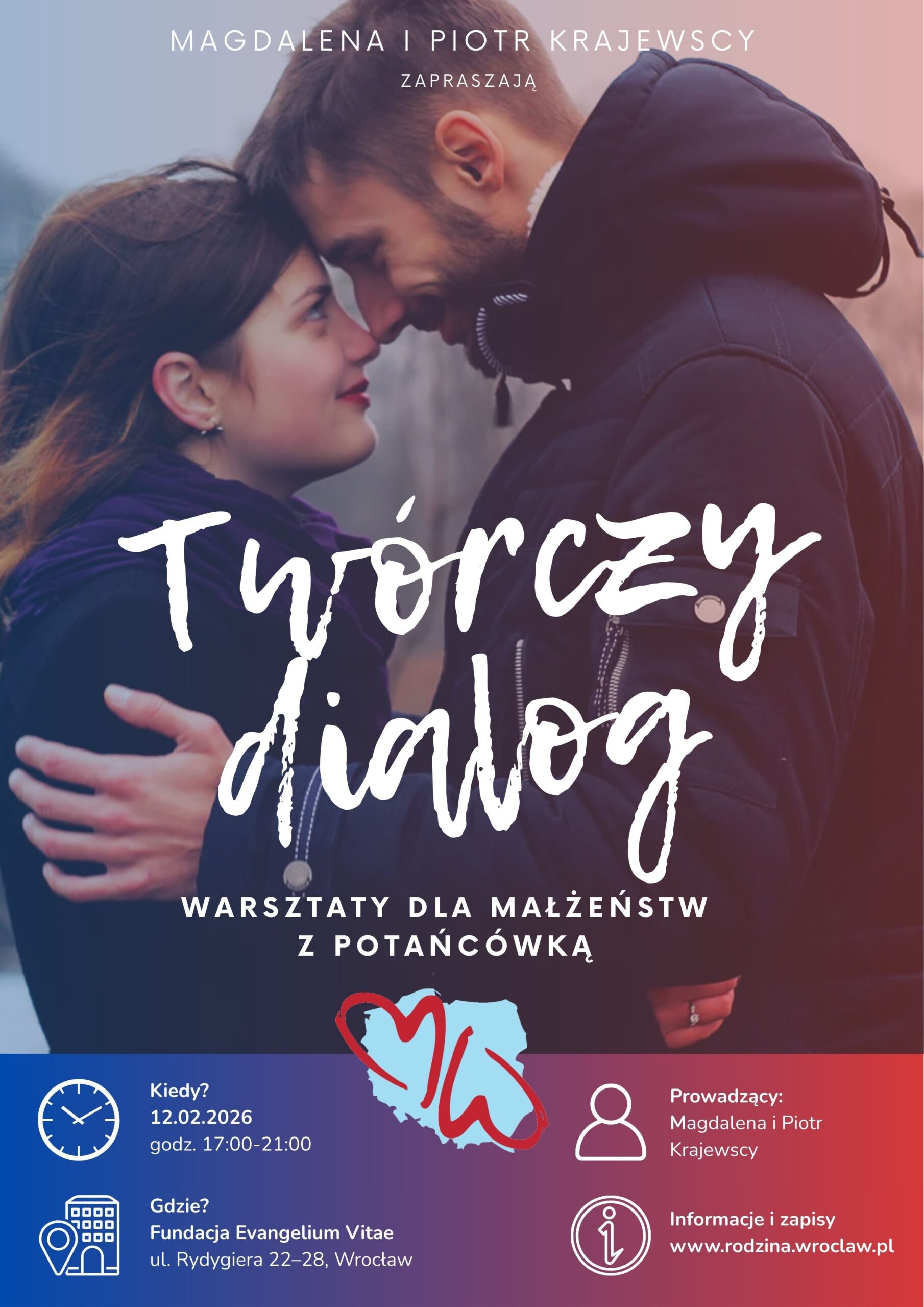 Co: Warsztaty dla małżeństw: “Twórczy dialog” z randką małżeńską w trakcie i materiałami na kolejne do wykorzystania w domu Kiedy: 12.02.2026 w godzinach 17:00-20:00 Gdzie: Fundacja Evangelium Vitae, ul. Rydygiera 22-28 Prowadząca: Magdalena Krajewska Informacje i zapisy: https://rodzina.wroclaw.pl/2026/01/16/tworczy-dialog-warsztat-dla-par-w-ramach-tygodnia-malzenstwa-14-02-2026r/