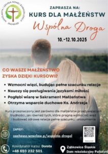Zapraszamy serdecznie wszystkie pary do udziału w kursie “Wspólna Droga”, który organizujemy dla małżeństw przeżywających trudności oraz chcących pogłębić swoje relacje. Więcej szczegółów: https://zacheusz.wroclaw.pl/wspolna-droga/
